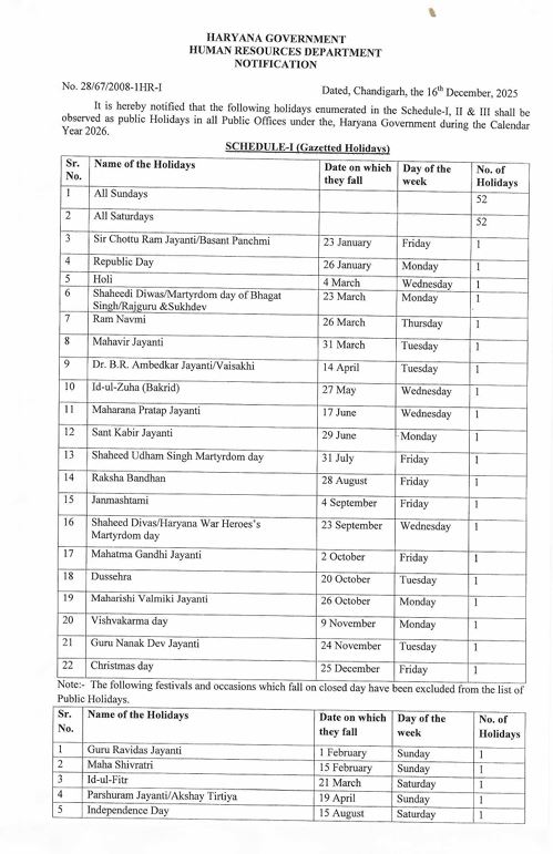 Yuva Haryana : हरियाणा सरकार ने अगले साल 2026 के लिए सरकारी छुट्टियों का कैलेंडर जारी कर दिया है। सरकारी दफ्तरों में सार्वजनिक अवकाश, प्रतिबंधित अवकाश और विशेष दिवसों की घोषणा की गई है, जिनमें सरकारी कर्मचारियों के लिए छुट्टियों की भरमार है।